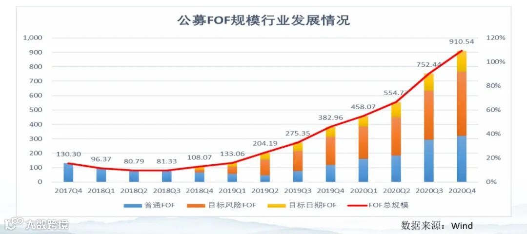 据Wind统计,截至2020年底,公募FOF基金规模达882亿元,在过去10个季度的复合增速为每季度30.3%,年化增速达到260%。中信证券研究部估算,私募类FOF规模约为2000亿元。
