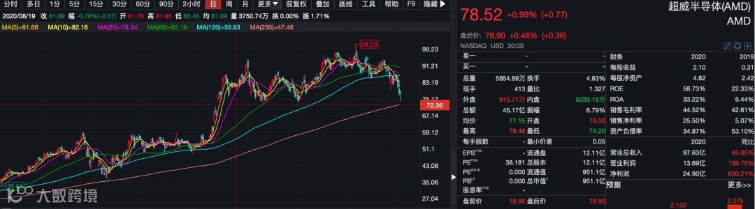 与之相对,AMD的股价在2020年却接近翻倍。虽然进入2021年后有所回调,但自2020年年初以来的涨幅依然超过了60%。