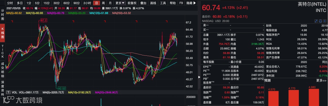 出色的业绩对于英特尔的股价却没有形成强力支撑。数据显示,英特尔公司股价2020年以来经历了几次大幅回调。截至3月5日,该公司股价仅有60.74美元每股,和2020年初的高点相比还下跌了约10%。