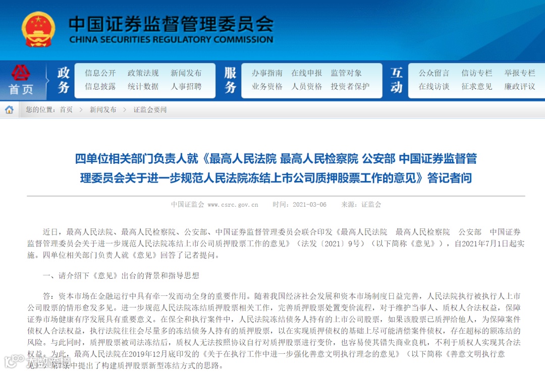 近日,最高人民法院、最高人民检察院、公安部、中国证监会联合印发《最高人民法院 最高人民检察院 公安部 中国证券监督管理委员会关于进一步规范人民法院冻结上市公司质押股票工作的意见》(以下简称《意见》),自2021年7月1日起实施。