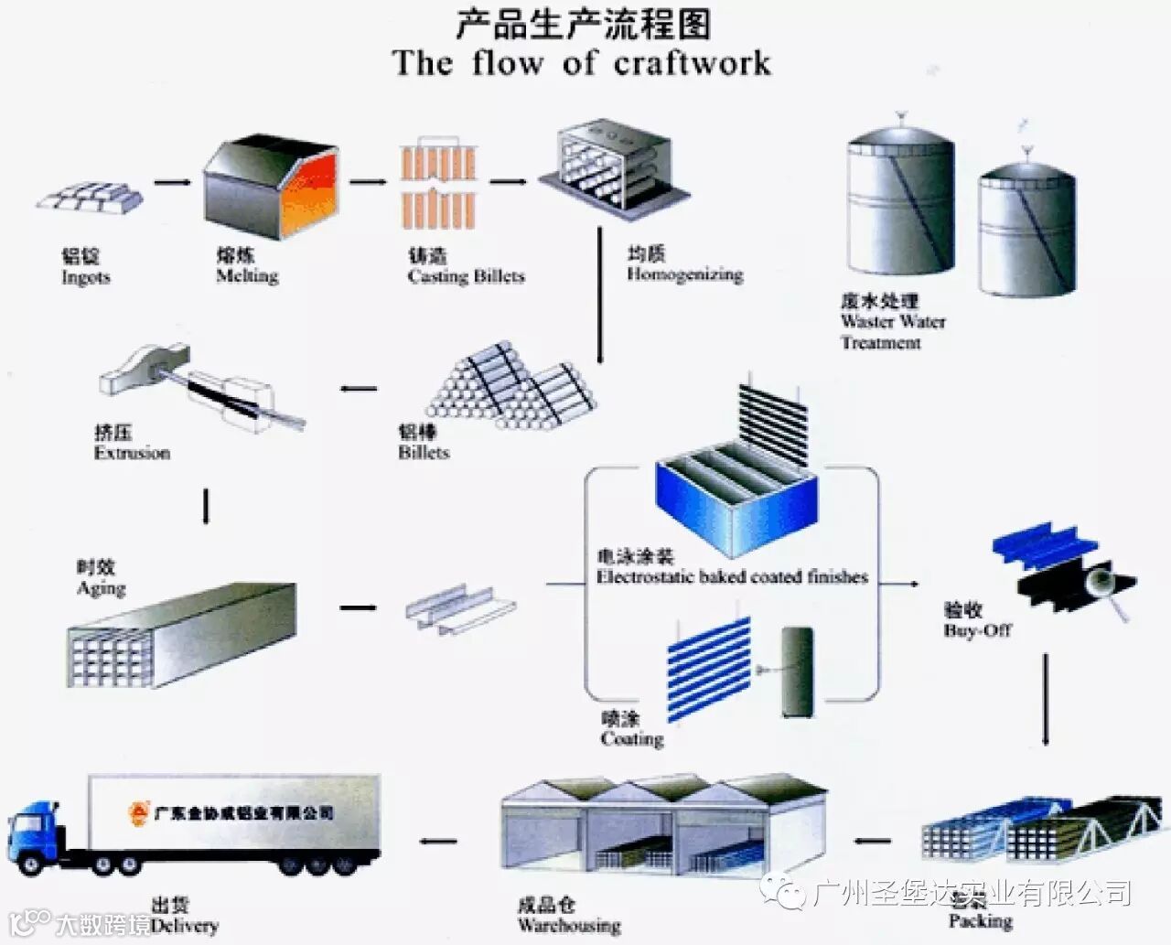 a、 铝材的生产工艺:熔铸-均质-挤压-矫直-时效-表面处理-包装