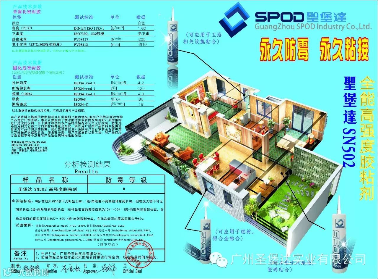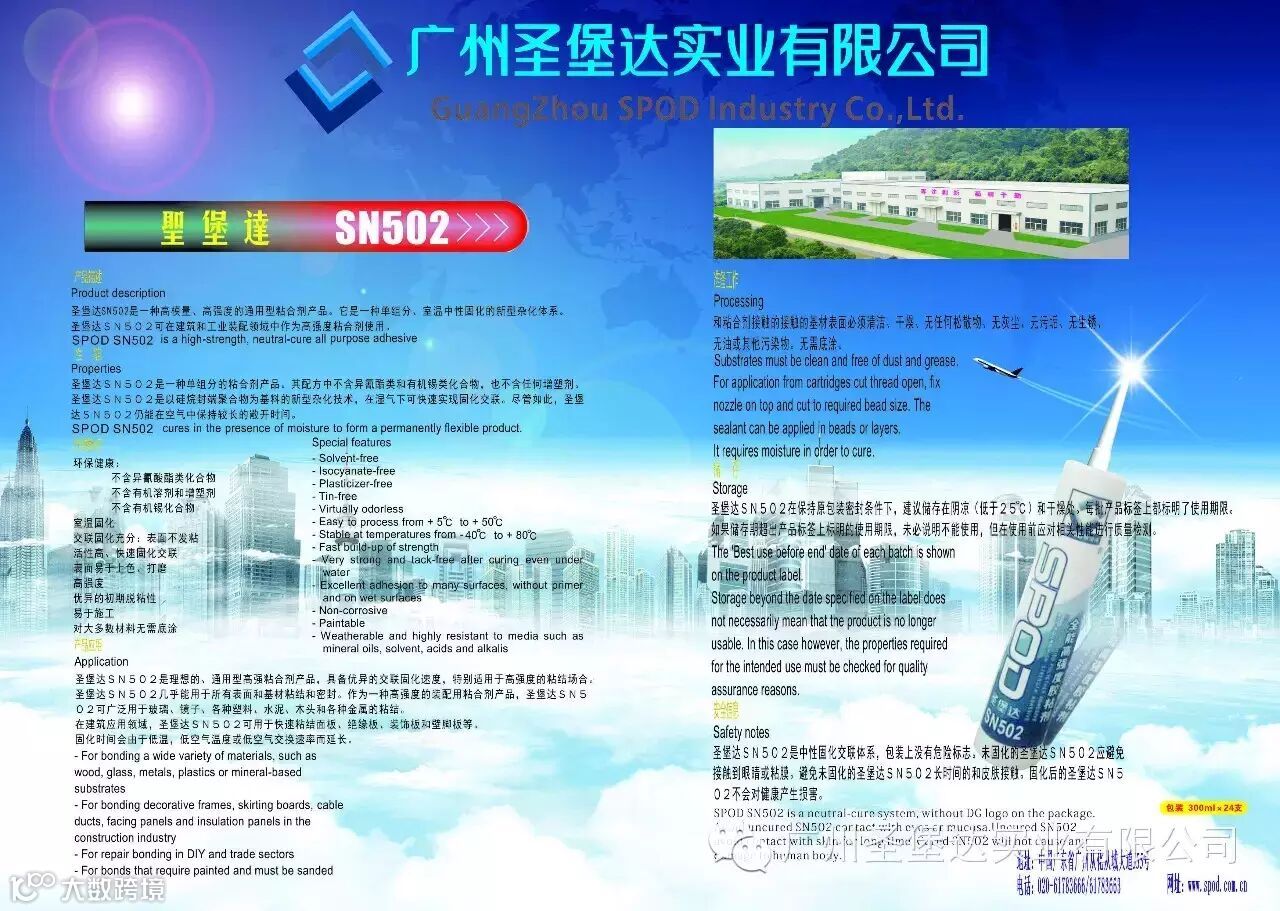 圣堡达SN502是一种高模量、高强度的通用型粘合剂产品。它是一种单组分、室温中性固化的新型杂化体系。