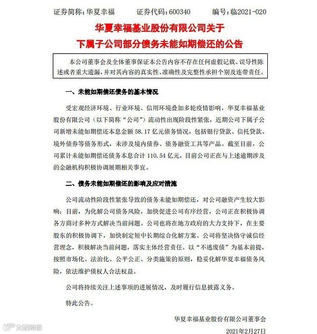 截至目前,华夏幸福累计未能如期偿还债务本息合计110.54亿元,目前公司正在与上述逾期涉及的金融机构积极协调展期相关事宜。