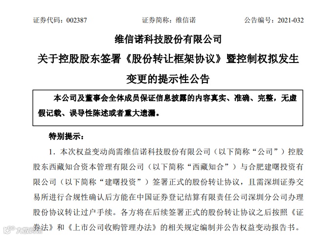 维信诺3月7日晚间公告,公司控股股东西藏知合拟向建曙投资转让公司股份1.6亿股,占公司股份总数的11.7%;建曙投资另与公司第二大股东签署了《一致行动协议》。如股份转让事项完成,建曙投资及其一致行动人合计持股比例21.33%,公司控制权将发生变更。与此同时,经公司向深圳证券交易所申请,公司股票自2021年3月8日(星期一)开市起复牌。