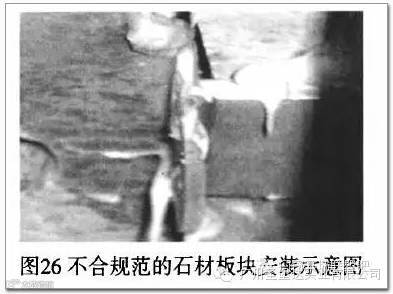 首先应对金属构件、连接件进行检查、测量、调整;对于石材板块的安装挂件要认真核对其质量是否符合设计要求,其生产质量是否符合国家相关规范要求,对于不满足或不合格的材料坚决重新生产或订货;对于短槽石材安装方式,首先必须在石材安装短槽内满涂石材干挂专用胶,在充分满涂后再进行石材安装定位,在定位、调节好以后再次涂抹石材干挂专用胶;严禁将石材板块采用其它措施调节、固定定位后再进行石材干挂专用胶的填充,这样会带来石材挂接槽内空腔,由此带来石材安装后存在脱落隐患;如图26就是非常不合理的安装方式。