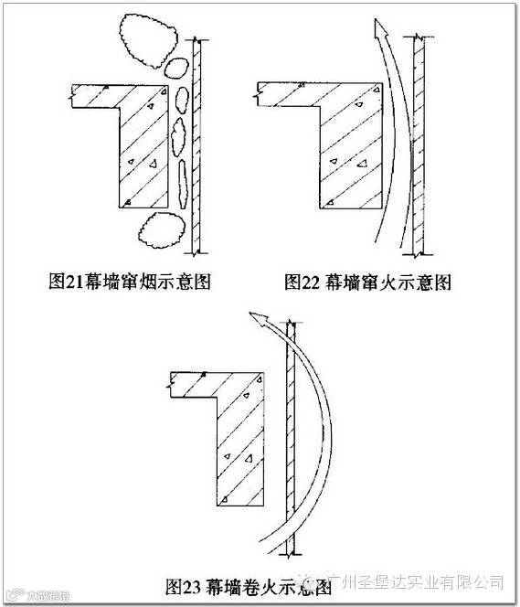 石材是一种脆性材料,在高温情况下容易发生变形、炸裂破碎等状况,从而,造成板块的脱落,火焰会沿着破碎位置向上窜至上层墙面而进入室内,见图2l、图22、图23;此外,如果防火层处理不到位,火焰所产生的烟雾会窜至上层,造成人员的窒息;幕墙的防火层托板必须使用经过防腐处理(镀锌)而且厚度不小于1.5mm的耐热钢板,严禁使用铝质板材代替;耐热钢板安装必须有一定的搭接余量(搭接余量应为30~50mm宽度),所有的搭接位置必须采用防火密封胶封堵,防火密封胶要提供法定检测机构出具的合格报告;在合格的防火密封胶施工打胶工序后,注意观察防火密封胶的固化时间,待固化具有一定的硬度后要抓紧再打一道耐候密封胶给予外表面保护,便于确保防火密封胶的长期有效性;防火棉的安装要不松懈、不遗漏、不留缝隙,防火棉的铺设厚度应不小于100mm,严禁采用水泥砂浆等干硬性材料来代替防火棉;安装完毕后,必须检查所有的防火节点是否密封严密,如有遗漏必须立即修复;安装合格的防火体系,必须自检形成记录,及时做好验收。