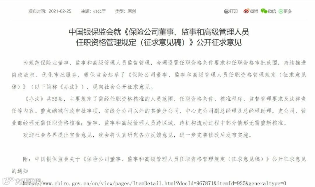 2月25日,银保监会就《保险公司董事、监事和高级管理人员任职资格管理规定(征求意见稿)》(简称“《办法》”)向社会公开征求意见。