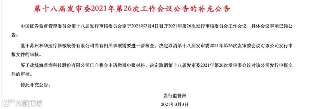 就在3月3日晚,证监会发行部公告称,鉴于林华医疗尚有相关事项需要进一步核查,以及鉴于海普润已申请撤回申报材料,决定取消对上述两家IPO企业的上会审核。