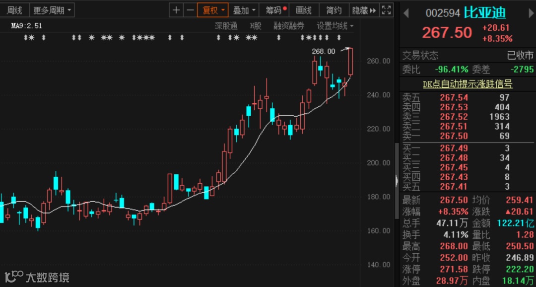 比亚迪今日高开高走,截至收盘,涨8.35%,股价报267.5元,总市值达7145亿元。