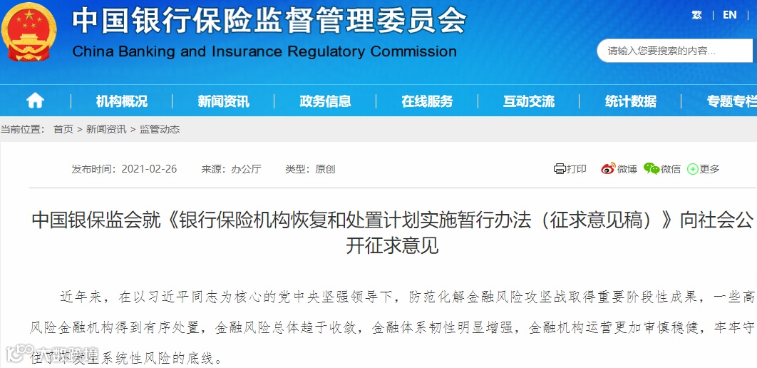 2月26日,银保监会发布《银行保险机构恢复和处置计划实施暂行办法(征求意见稿)》(以下简称《办法》),并向社会公开征求意见。《办法》立足于指导银行保险机构未雨绸缪、防患于未然,从制度上预先筹划重大风险情况下的应对措施。