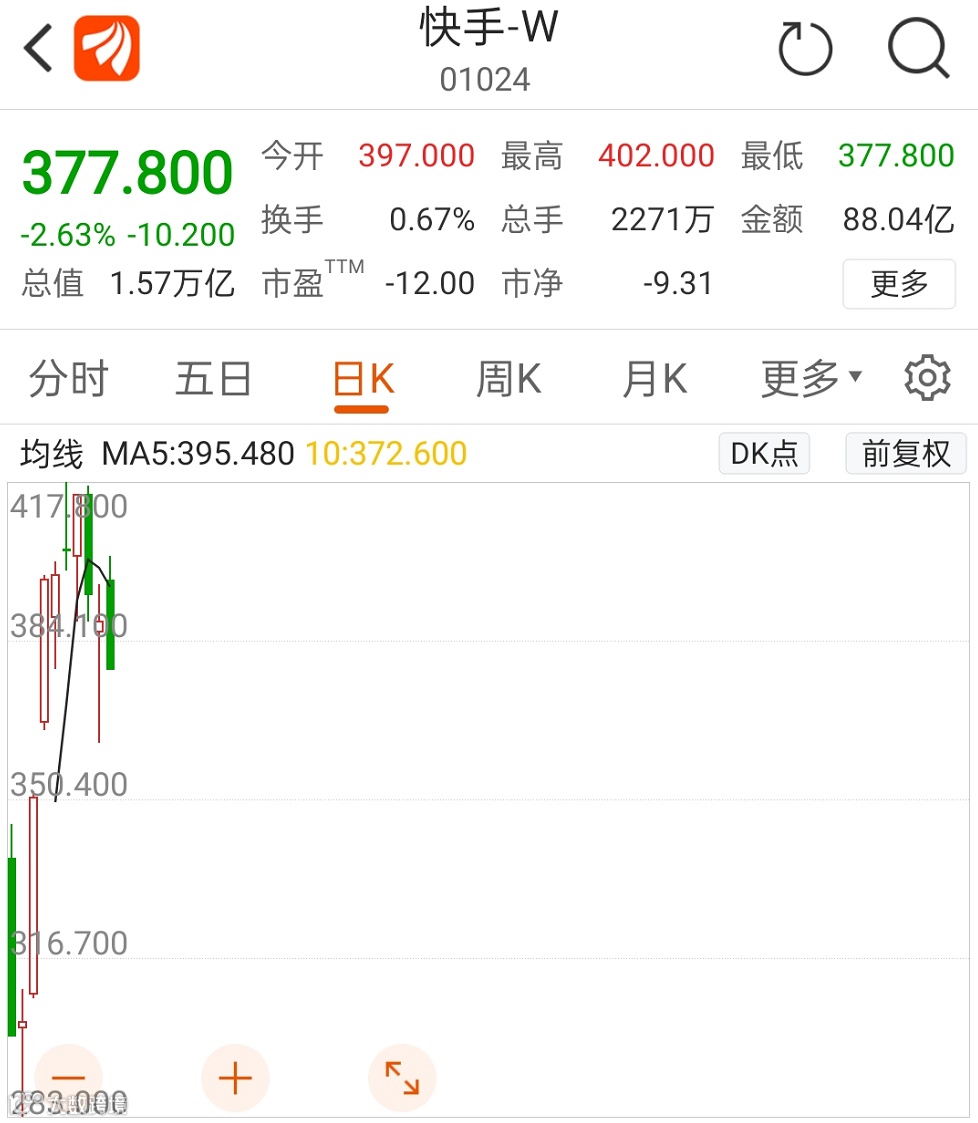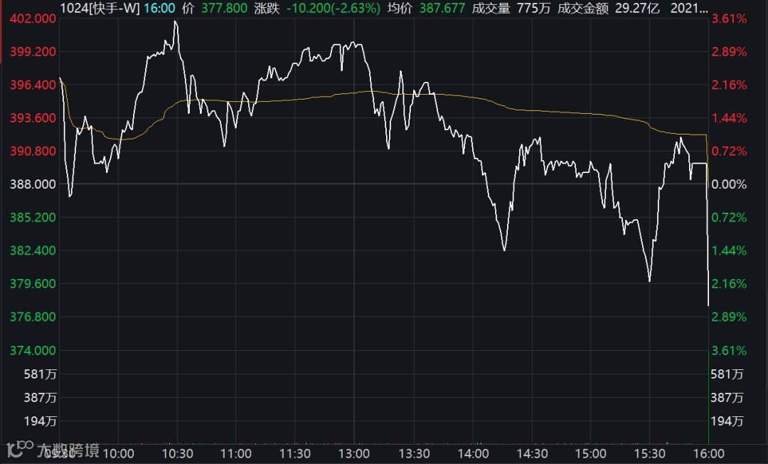受此影响,22日收盘,快手大跌2.63%,报收377.8港元/股,而在尾盘集合竞价前,快手的涨幅为0.46%,股价为389.8港元。以此计算,集合竞价的抛盘瞬间砸掉了快手近500亿港元的市值。