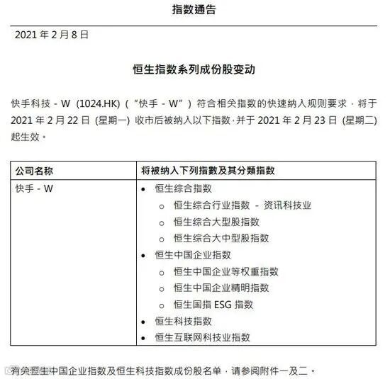 据恒生指数公司公告称,快手科技-W(1024.HK)符合相关指数快速纳入要求,将于2月22日(星期一)收市后被纳入恒生综合指数、恒生国企指数、恒生科技指数及恒生互联网科技指数。
