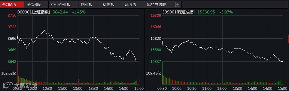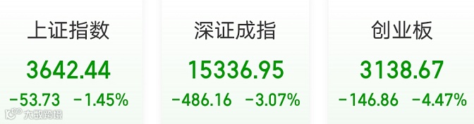 牛年的第一个黑色星期一来了!2月22日,上证指数收跌1.45%,报3642.44点;深证成指跌3.07%,报15336.95点;创业板指大跌4.47%,报3138.67点,单日跌幅创近半年新高。两市放量成交1.29万亿元,较上日放量逾2500亿元。