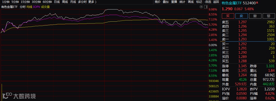 周期股全线爆发,有色板块铝、镍、钴,稀土等多个细分题材共振。钢铁、化工、造纸、煤炭等其余周期股亦持续表现,中国中冶、中泰化学、金牛化工、山鹰纸业、天山铝业、章源钨业等多只股票摘得连板。有色ETF收盘狂涨5.48%。