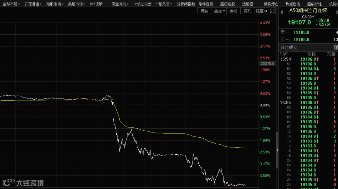 由于权重股杀跌,外围A50期指也出现暴跌,盘中跌幅超4%。