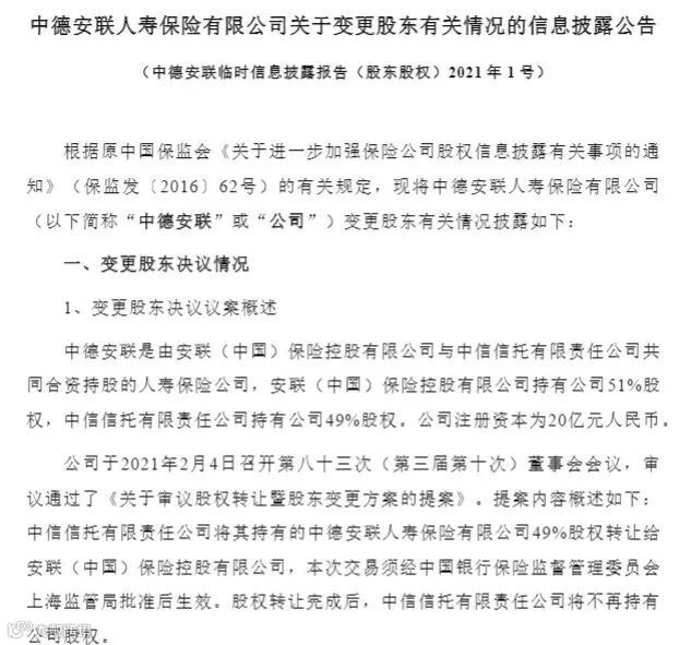 中德安联2月4日召开的第83次董事会审议通过提案,全体董事一致同意中信信托将其持有的49%股权转让给安联中国保险控股。