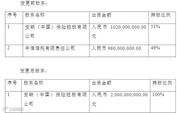 此次股东变更完成后,中信信托将不再持有中德安联股权,安联中国保险控股将持有公司100%股权。