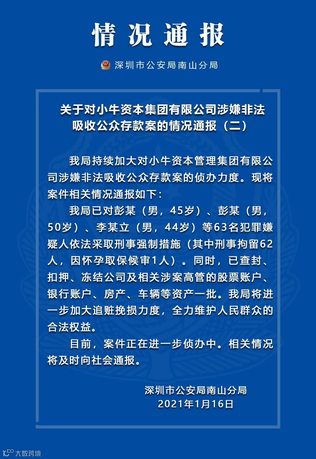 券中社1月16日讯,今日深圳市公安局南山分局发布《关于对小牛资本集团有限公司涉嫌非法吸收公众存款案的情况通报(二)》,据通报显示,南山公安分局已对彭某(男,45岁)、彭某(男,50岁)、李某立(男,44岁)等63名犯罪嫌疑人依法采取刑事强制措施(其中刑事拘留62人,因怀孕取保候审1人)。同时,已查封、扣押、冻结公司及相关涉案高管的股票账户、银行账户、房产、车辆等资产一批。