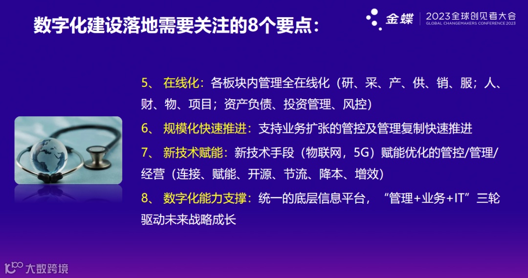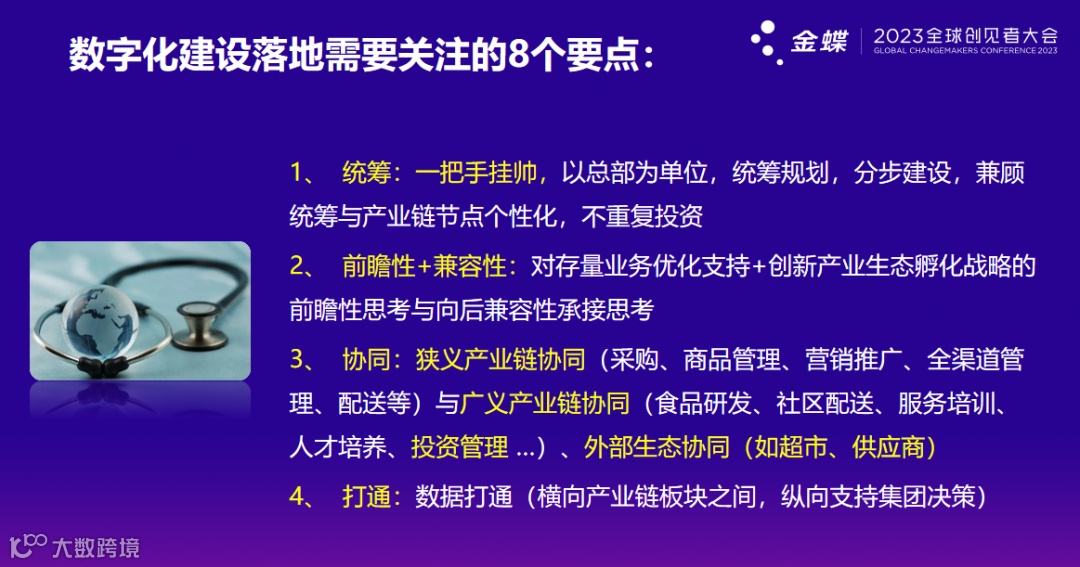 第四个是平台层面。要构建一体化平台来支撑整个集团数字化转型。目前我们运用金蝶云·星空餐饮云作为一体化支撑平台,以财务为中心,引入生产制造,引入餐饮的专用板块,后续还会加入管易云等电商系统平台。