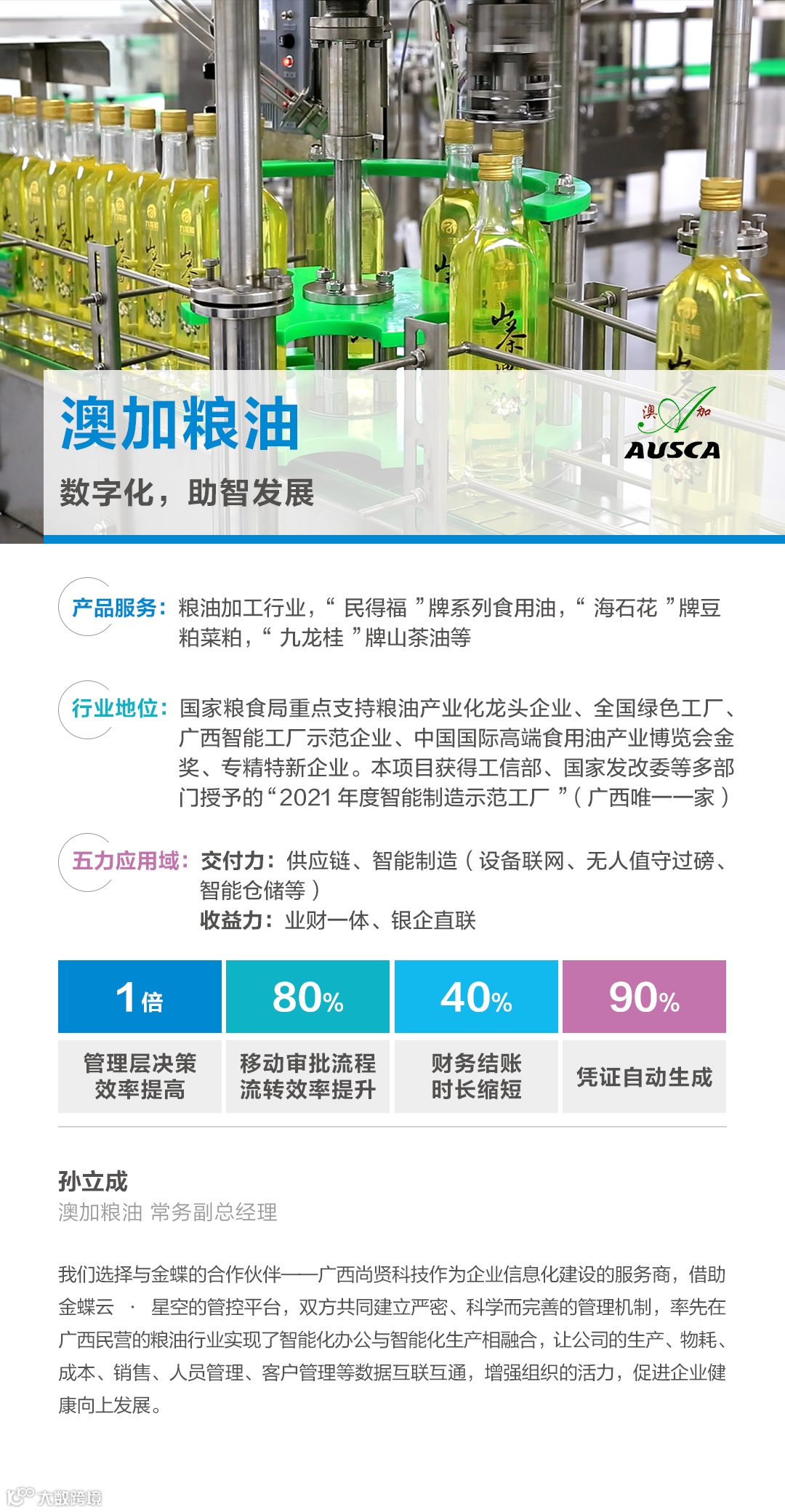 2019年澳加粮油与尚贤科技(广西金蝶伙伴)正式签署协议,双方共同合作打造粮油企业的数字化工厂管理平台,尚贤科技为澳加粮油实现智能制造提供软件基础和信息化技术服务。金蝶云产品的开放性,可迅速解决澳加粮油多种智能设备和系统对接的需求,同时多组织多核算体系、全成本核算、移动应用等,能承载澳加粮油未来的发展规划需求。双方共同努力,目前企业已实现: