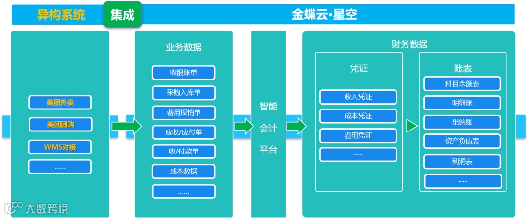 集成异构系统,整合收银账单、采购入库单、费用报销单、应收/应付单等业务数据,通过智能会计平台,生成收入、成本、费用等凭证,获取明细账、出纳账等账表财务数据,实现业财一体化。