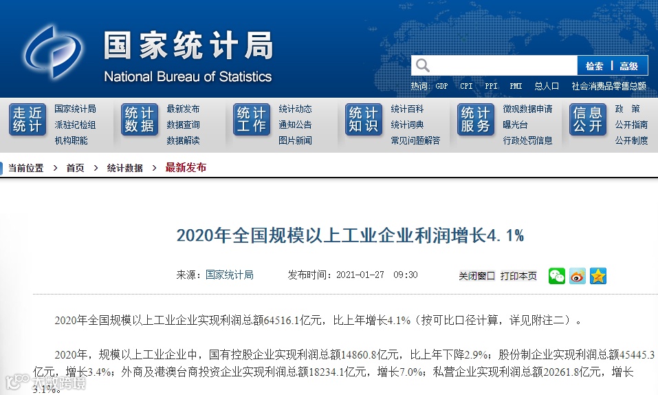 2020年12月份,规模以上工业企业实现利润总额同比增长20.1%。这是继11月单月同比增速下降后,再次实现掉头向上,也是连续7个月月度增速保持两位数增长。