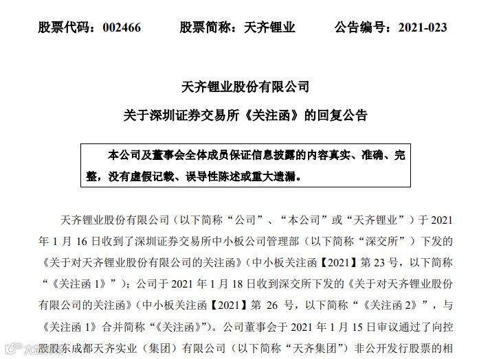 经过近半个月的等待后,天齐锂业在1月29日正式公告回复交易所《关注函》,针对此次定增披露及终止相关问题逐项进行了核查及分析说明。