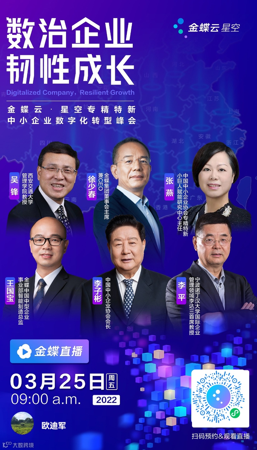为了帮助更多高成长型企业摆脱困境、了解政策并积极投身其中,2022年3月25日,金蝶云·星空携手中国中小企业协会联合举办 “数治企业 韧性成长——专精特新中小企业数字化转型峰会”,为您奉上一场“专精特新”盛宴,向内解读时代,共论一条助力中小企业构建自身核心竞争力的发展正途。