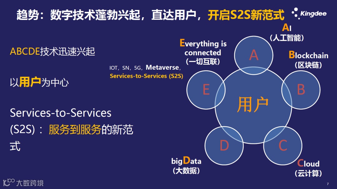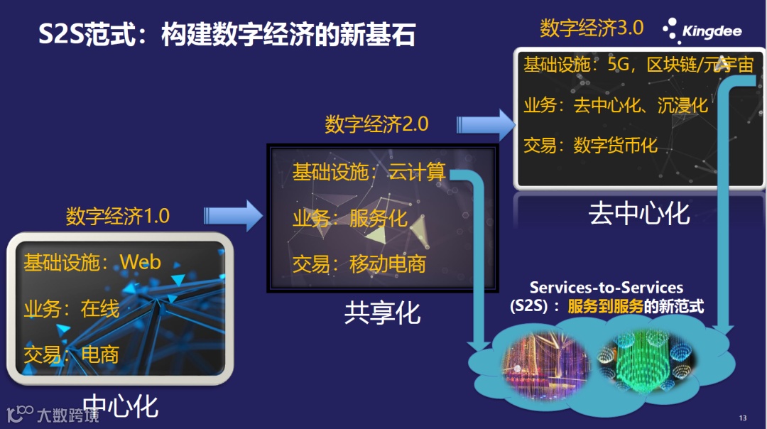 作为数字经济本质的数字服务化的第二个维度是服务化。服务是有专门的术语解释的,它是消费者与提供者之间通过一系列的互动来提供解决方案或创造价值的。把数字和服务化组合在一起,就构成了数字经济的本质,就是数字服务化。在数字经济发展的过程中,我们正在经历的数字经济2.0时代以云计算为基础设施,未来20年将以区块链、元宇宙为基础设施,他们中间会共享一个核心的基石,那就是服务到服务的一种新范式,因为云计算会逐渐成为各种服务组合的平台和交互的平台。而在区块链和元宇宙当中,几乎所有的业务场景都会以服务的方式在线,5G更不用说,5G的核心架构也是基于服务为导向的,所以整个的基础设施都会成为一种服务到服务的新范式,即S2S,这也是连接数字经济2.0和数字经济3.0无缝的桥梁。