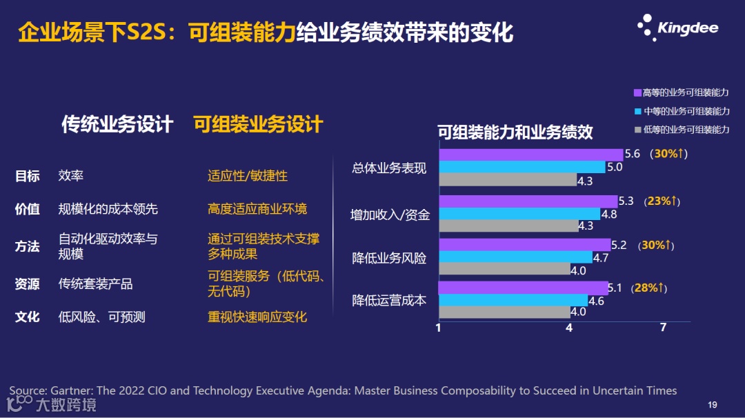 在企业的场景当中,这种服务到服务的可组装能力,会给企业带来不一样的改变吗?在Gartner2022年对于CIO的一个调研中,我们发现,传统的业务设计在效率规模化、灵活性方面还有很大的缺陷,而通过这种服务的可组装设计以后,可以增加收入,降低运营和业务的风险,并且快速地响应外面的变化。