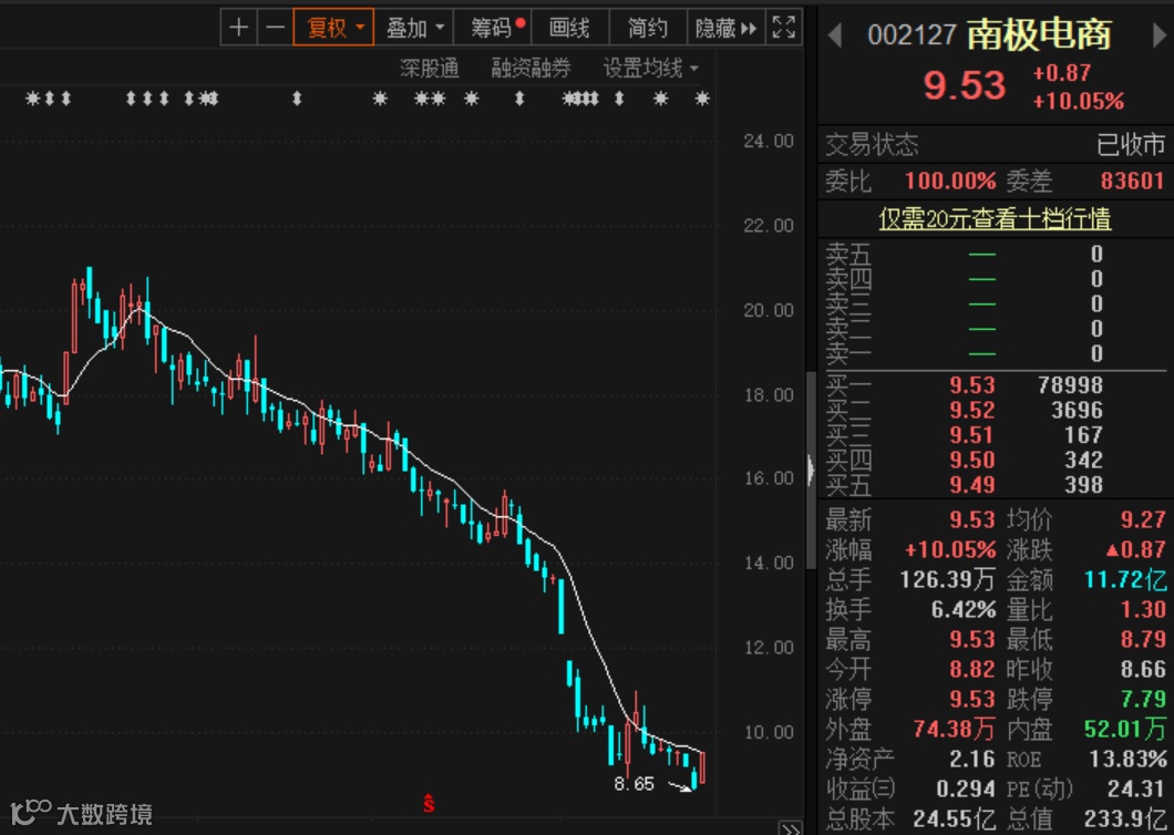 南极电商1月27日股价小幅高开,此后一路走高,临近中午股价已封住涨停板。截至收盘,南极电商报收9.53元,涨幅10.05%,成交11.72亿元,涨停封单超7.9万手。