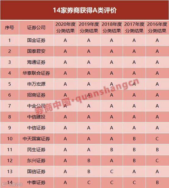 就14家A类券商来看,分别为国金证券、国泰君安、海通证券、华泰联合证券、申万宏源、招商证券、中金公司、中信建投、中信证券、中天国富、民生证券、东兴证券、国信证券和中泰证券。其中,前9家公司已连续5年获得A类评价,“强者恒强”的格局凸显。