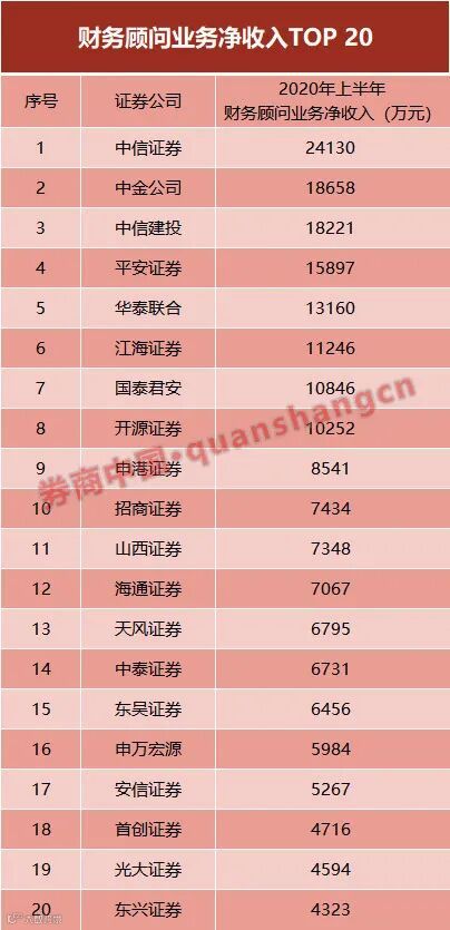 此前,中证协曾通报2020年上半年业务数据排名,除了一众头部券商之外,江海证券、开源证券、申港证券、首创证券均杀入财务顾问业务净收入TOP20的名单当中。