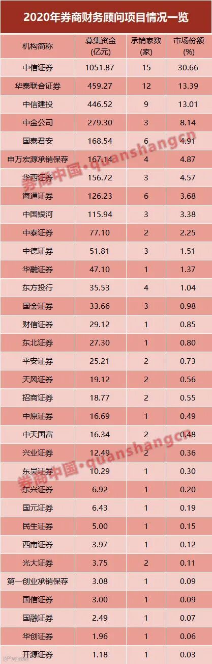 除了中信证券外,华泰联合证券和中信建投的项目规模也在400亿元以上,市场份额超过13%。按上市日计算,仅有30余家券商在年内服务的财务顾问项目落地。