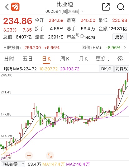 A股新能源汽车龙头比亚迪也屡创新高,今日早盘,比亚迪(002594)股价涨超5%,再度刷新历史新高,截至收盘,比亚迪报收3.23%,总市值超6000亿元。自2020年以来,比亚迪股价涨幅超过4倍,创始人王传福的身价也水涨船高。