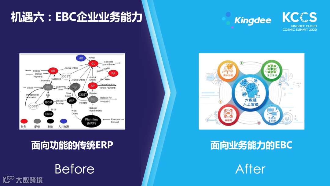机遇六:EBC企业业务能力会替代传统的ERP,而这个时代已经来临。过去很多企业都是非常复杂的、庞大的ERP系统,但是未来通过云计算企业形成自己的基础设施,形成自己的PaaS和SaaS,自己的EBC,EBC构建了五大平台,面向客户的体验平台,面向伙伴的生态平台,物联网平台以及企业内部的数字化平台,其中一个非常重要的就是大数据分析平台,每个企业都需要有一个大数据分析平台。新的场景会演变成EBC能力,将会大大提升企业的核心竞争力。