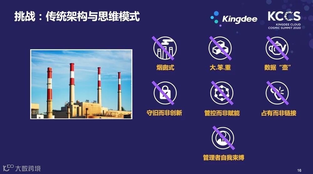 最大的挑战是什么?是传统的企业数字化架构与思维模式。传统的架构是什么架构?有的人叫单体架构,有的人叫传统架构,其实它的本质是烟囱式架构,现在很多企业特别是大企业经过多年的发展,特别最近这几年的数字化转型,形成庞大的遗留资产,这个资产因为过去的烟囱式架构而使得转型变得非常困难,烟囱式架构就是条块分割,很多孤岛各自为政。因为系统庞大,很重,所以我们把它称之为“大、笨、重”,有的大企业有几百个信息系统,甚至还有的企业有上千个(信息系统),如果把这些“大、笨、重”的系统进行彻底的改变和转型,这不是一件容易的事。这就是烟囱式,虽然有数据,但是数据都在每个分割的条块里面,在“数据壶”里倒不出来,由于烟囱式的系统会“大、笨、重”和形成“数据壶”,所以企业创新困难,产生了一个习惯就是守旧而非创新,当企业遇到外部环境变化的时候,问题就会凸显。例如在这次疫情,我们看到一些企业系统不能通过移动、互联网进行访问?为什么数据不能连接、不能打破?因为全分家了。