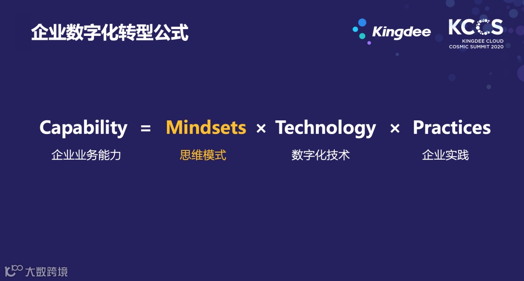 机遇之外,企业数字化转型最大的挑战是什么?EBC要形成,就必须要充分的考虑这三个因素:一是企业实践,比如说产生新的业务场景;二是新的技术;三是思维模式改变。这三个要素不是相加的关系,它是乘的关系,它会让企业数字化转型产生倍增效果,特别是思维模式。