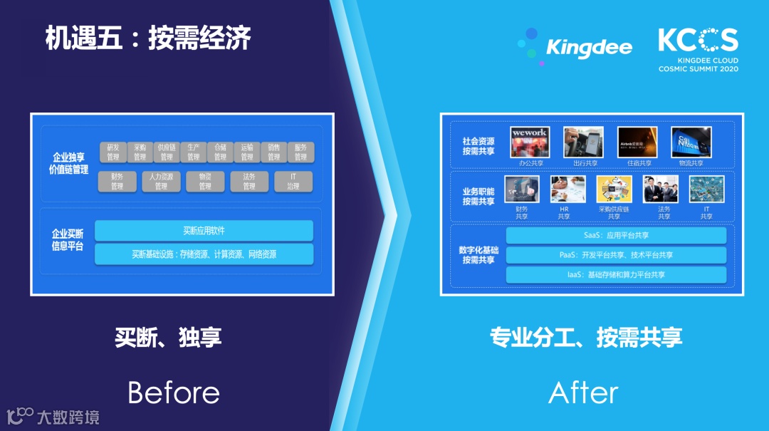 机遇五:按需经济。每一个企业很习惯于自己拥有某些知识或者是产品,选择买断独享,但是未来按需经济将会成为新经济的主要成分,而这其中云计算是最大的按需共享经济。我多年前看过《云经济》,它的作者讲现在这个时代因为云计算而会产生更多的罗马大道,就会有更多的车水马龙在罗马大道上面奔驰,所以一个富有想象力的、繁荣的新经济将会诞生。