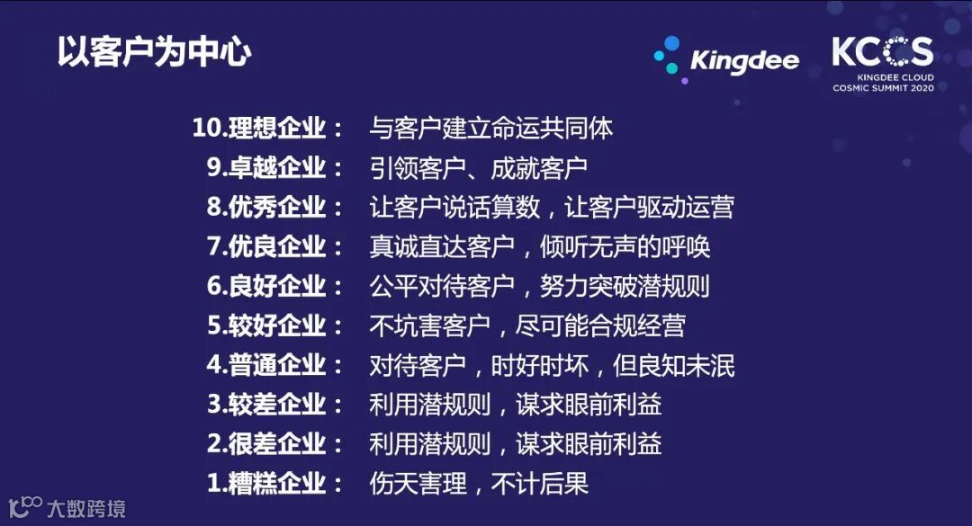 以客户为中心到底有多大的层面?每个企业都在以客户为中心,到底你的企业在哪个层面?很多企业可能要做到合规经营都是不容易,优秀的企业就是让客户说话算数,让客户驱动企业,卓越的企业就是引领客户、成就客户,最高境界与客户建立一个企业命运共同体。所以以客户为中心其实是代表着数字化管理者的境界和格局。我们的境界、格局有多高,我们对以客户为中心的认知就有多高,以客户为中心的认知越高,你的数字化转型动力就越足,决心就越大。