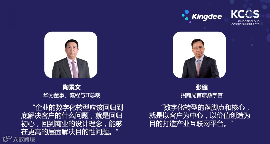 我今天很荣幸邀请了华为董事、CIO陶景文先生和招商局集团首席数字官张健先生参加今天的峰会,我从他们两位所属企业的数字化转型当中都感受到,大企业的数字化转型不仅仅是一个事上的转型,更是一种心上的用功。陶景文先生讲到“企业的数字化转型应该回归到底解决客户的什么问题,就是回归初心,回到商业的设计理念,能够在更高的层面解决目的性问题”。为什么要转型?为什么要颠覆?这样的力量、决心和韧劲是从我们内心当中涌现出来的。华为在这一两年发生了很多事情,但是陶景文先生领导的数字化转型很好的支撑了华为的发展。张健先生讲到“数字化转型的落脚点和核心,就是以客户为中心,以价值创造为目的打造产业互联网平台”,张健先生常常讲要打造一个数字孪生的招商局,这个招商局是民族工业的先驱,我本人原来也是从招商局出来的,在跟招商局20多年的合作当中我深深感受到招商局发生了多次蝶变,要打造一个全新的数字孪生世界需要多大的决心和勇气,所以他们两位都是以客户为中心的。
