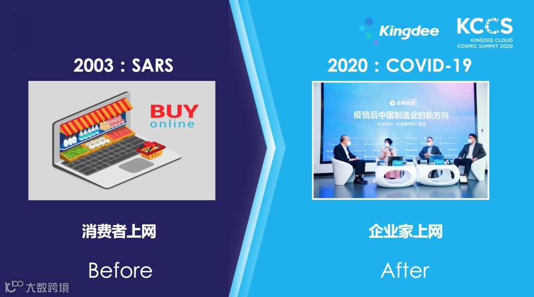 2003年一场SARS,让电商风起云涌。2020年新冠疫情,我想其实是让企业家上网,让更多传统产业的企业家上网。今年3月17号我跟深圳的两位企业家——光峰的薄连明和柔宇的刘自鸿一起走进格力,与董明珠对话直播,当天的直播量达到330万人次,董明珠很震惊,她说原来还有这样一种玩法(可以继续卖格力空调)。我记得当时他们IT部门的总经理讲董总,我邀请你来直播你不直播,为什么金蝶邀请你直播你就直播?她没有回答,但是直播结束以后她跟她的下属讲说我明天就要开始直播,大家知道后来董总的第一次快手直播30分钟就实现了3个多亿的销售额。除了董明珠女士以外,有多少传统产业的企业家,因为这次疫情他们都上网了,因为互联网,世界被打开;因为互联网,格局被打开。一个更为广阔的产业互联网的时代已经来临,数字化转型,已经真正的深入到每一个传统产业和传统企业当中,一个令人激动人心的时代已经来临,数字化管理者真正的大舞台已经呈现在我们的眼前。