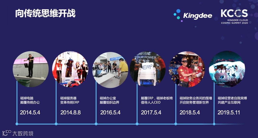 金蝶作为一个20多年的传统企业公司要转型谈何容易?所以不砸不行。我在2014年砸掉笔记本电脑,使用一部手机移动办公,其实做移动办公软件金蝶是最早的,移动协同平台,2014年5月4号诞生的。在2014年8月8号我砸掉了服务器,把我们的客户中天装饰的服务器砸掉了,我指定公司的一位经理人负责这个业务,他跟我一起砸的服务器,砸完以后他告诉我这个活干不了,因为金蝶的云计算当时还没有。但是2019年,金蝶云收入已经占集团总收入的39.5%,而且金蝶的企业SaaS服务还在快速、高速的增长。接下来几年我都在砸,特别是2017年我在北大砸掉了ERP,当时很多人不理解你干了20多年的这个产品砸了,你卖什么,我说ERP必须要颠覆,现在有了一个新的概念,那就是EBC(企业业务能力),去年我砸掉了束缚我们的茧,今天还要砸,到底砸什么?等会儿大家可以看到。