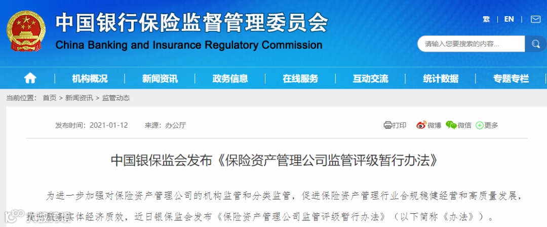 加强评级结果使用。根据监管评级结果,将保险资产管理公司划分为A、B、C、D四类机构,明确分类结果是衡量公司经营管理能力和风险管理能力的主要依据。对于不同类型机构,监管机构将在市场准入、业务范围、产品创新、现场检查等方面采取差异化的监管措施。
