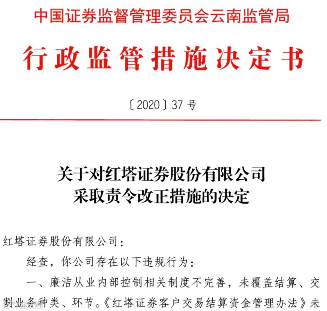 云南证监局认为,上述行为违反《证券期货经营机构及其工作人员廉洁从业规定》第四条、第六条、第七条和第十三条的规定。按照《证券期货经营机构及其工作人员廉洁从业规定》第十八条的规定,云南证监局决定对红塔证券采取责令改正的监督管理措施,要求红塔证券应学习证监会监管规定,采取措施加强廉洁从业管理,落实监管要求,并于12月31日前向证监局提交针对上述违规行为的书面整改报告。