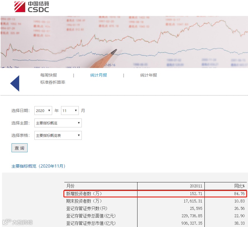 中国结算数据显示,11月份,市场新增投资者152.71万,同比增长84.76%,环比增幅超过36%。自今年3月份以来,A股新增投资者数量连续第9个月突破100万。今年前11月累计新增投资者数量已经超过1640万。