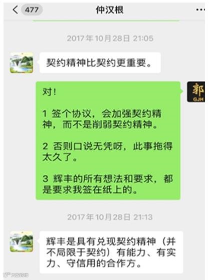 仲汉根则在2017年10月28日就签署协议事宜回复称,“契约精神比契约更重要。”当郭俊辉再次希望签署协议时,仲汉根称,“辉丰是具有兑现契约的精神(并不局限于契约),有能力、有实力、守信用的合作方。”