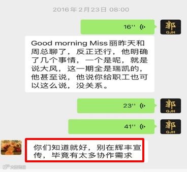 郭俊辉提供的与李萍的微信聊天记录则显示:2016年2月23日,郭俊辉发语音称,*ST辉丰实控人仲汉根认同在大丰建设的草铵膦项目属于瑞凯化工,“他(注:仲汉根)甚至说,你给你职工也可以这么说,没关系。”李萍回复称,“你们知道就好,别在辉丰宣传,毕竟有太多协作需求。”