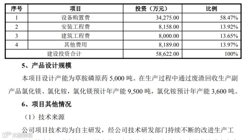 2016年4月21日,*ST辉丰公开发行了总额8.45亿元的可转债,其中5000吨草铵膦项目预计投资6.86亿元(项目建设投资5.86亿元,主要包括建筑工程投资、机器设备投资等;铺底流动资金1亿元)。经测算,该项目达产后预计可实现年均销售收入8.47亿元,年均实现净利润 3.42亿元。当时*ST辉丰称,“公司项目技术均为自主研发。”