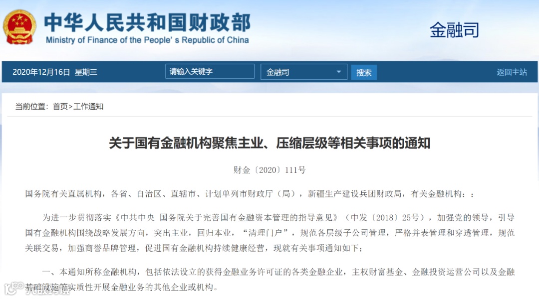12月16日,财政部发布《关于国有金融机构聚焦主业、压缩层级等相关事项的通知》,引导国有金融机构围绕战略发展方向,突出主业,回归本业,“清理门户”,规范各层级子公司管理,严格并表管理和穿透管理,规范关联交易,加强商誉品牌管理,促进国有金融机构持续健康经营。